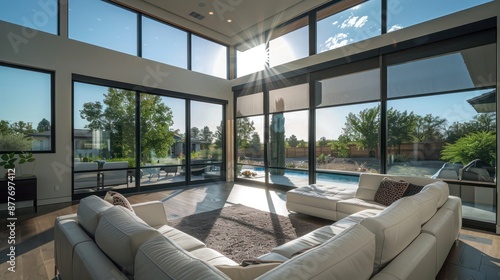 Contemporary suburban home with floor-to-ceiling, polarized windows that automatically tint based on sunlight intensity