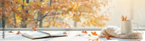 A charming fall scene of a student's desk with open notebooks, colorful leaves, and a soft blanket, set against a window showcasing a beautiful fall landscape