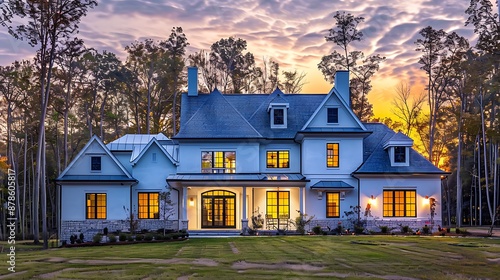 Stylish suburban French Provincial home with a light blue exterior, forest clearing, sunset,