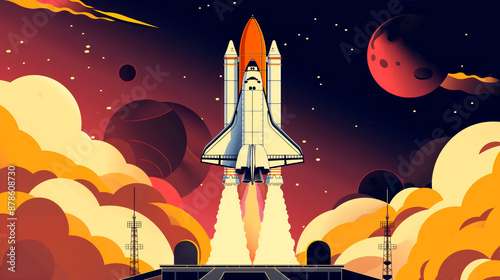 Stylized illustration of a space shuttle launching into a colorful cosmic sky with planets and clouds.