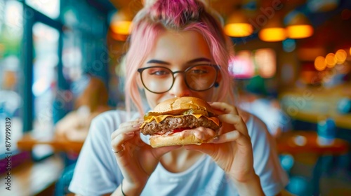Mujer joven, con el pelo rosa, mordiendo, ferozmente, una superhamburguesa. Concepto de nutrición y salud.