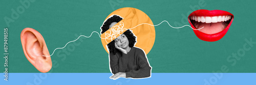 Composite artwork collage image picture of minded girl head string big mouth ear isolated on creative background