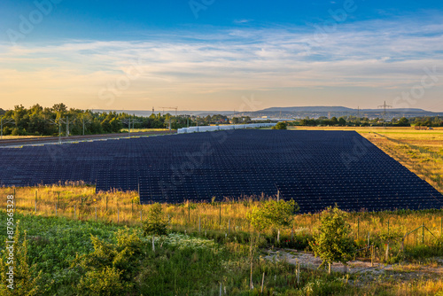 Ein großer weitläufiger Solarpark in Bayern entlang einer Bahnstrecke.