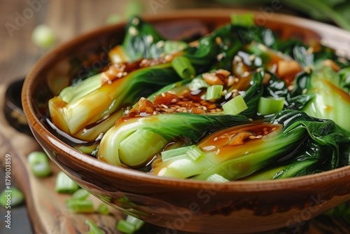 Chinese dish with bok choy in oyster sauce and garlic focused on