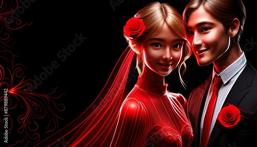 Para młodych ludzi w czerwonych strojach na czarnym tle