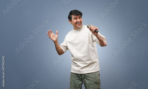 Alegre cantante latino con micrófono en la mano. Locutor. Expresiones humanas