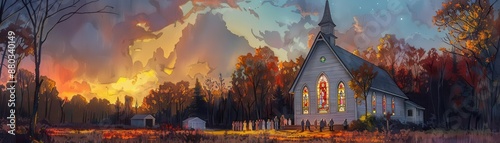 An old country church at dusk, warm light from stained glass windows, congregation in reverence, rustic charm, watercolor style, peaceful setting