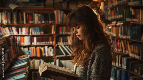 Female student reading a book in a library. Education and knowledge concept.