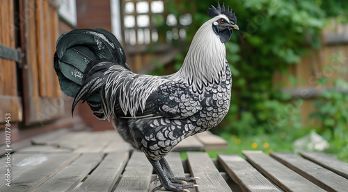 black white feather chicken, fancy chicken in home garden, exotic pet, Generative Ai not real chicken