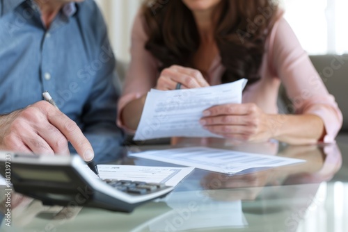 Woman Senior Bill Finance retirement couple home file calculator Paper wife budget old man together mature old retirement paperwork tax