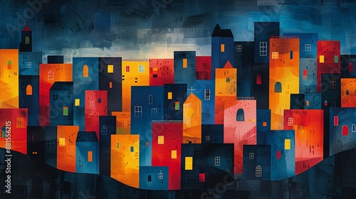 Colorful city blocks: abstract urban landscape with bold shapes and hues on a dark background, ideal for contemporary designs