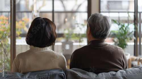 リビングルームのソファに座ってくつろいでいるミドル夫婦「AI生成画像」