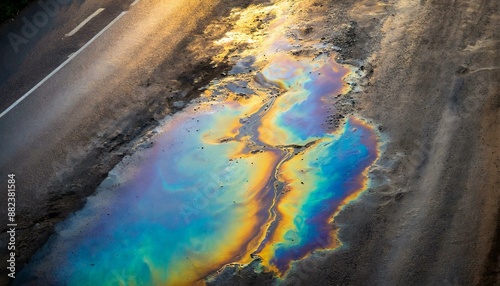 mancha de óleo colorida no meio do asfalto