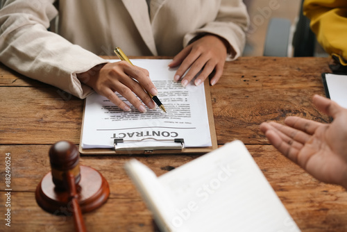 Lawyer and client discuss a contract at a wooden table in a professional setting, emphasizing legal advice and business agreements