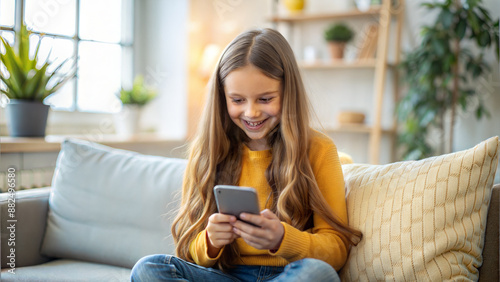 Happy little girl using smartphone while sitting on sofa in living room at home