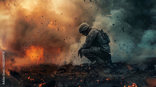 soldado en medio de explosiones de la guerra cansado y triste estresado y viviendo una pesadilla en la guerra