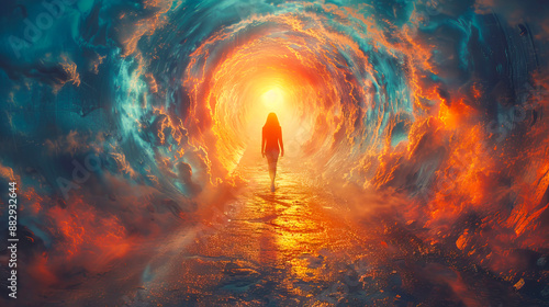 Woman walking into the light at the end of the tunnel in cloudy sky