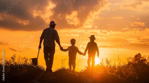 A family of four is walking through a field of flowers