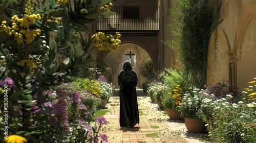 A nun walking gracefully through a flower-filled courtyard