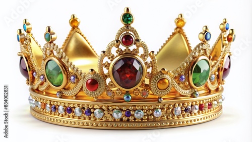 Majestic gold and precious gemstone-encrusted crown, symbolizing power and grandeur, sits regally on a pristine white background, evoking luxury and historical significance.