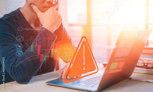 risk warning alert in financial and investment down trend economic global crisis concept Businessman using computer working with triangle sign analysis trading stock price chart