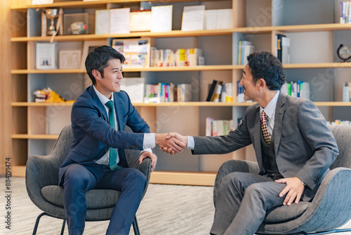 ロビーで握手するエグゼクティブ男性