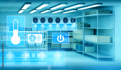 Industrial refrigerated warehouse. Room with freezing equipment. Storage with sub-zero temperatures. Refrigerated warehouse for freezing products. Industrial freezer with virtual buttons. 3d image