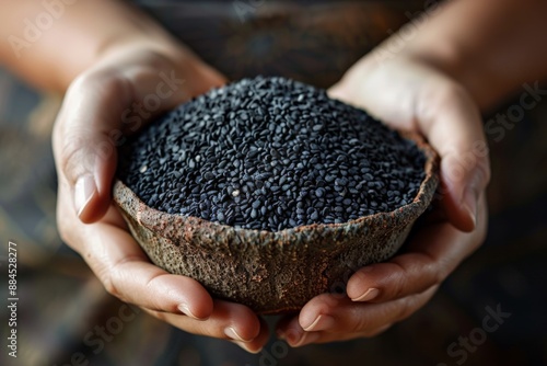 Hands holding a rustic bowl filled with black sesame seeds.