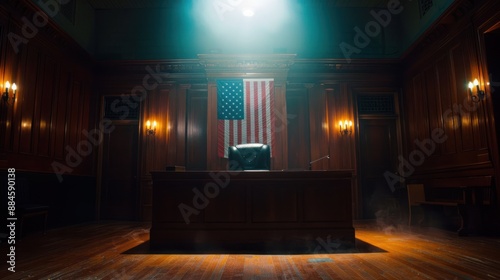 Empty courtroom at night, only the judge's chair illuminated