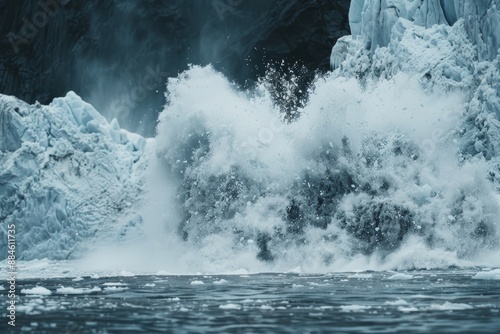 Massive ice chunk crashes into frigid waters. Spectacular explosion of frozen spray as glacier calves into the sea.