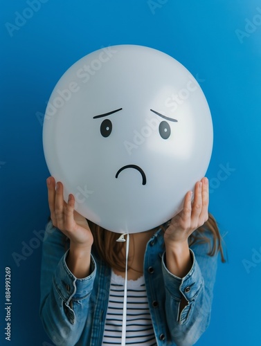 A woman is holding a white balloon with a sad face on it. The balloon is tied to her hand, and she is holding it with a frown. Concept of sadness and disappointment