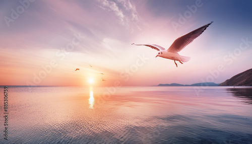 Krajobraz morski, ptak unoszący się nad wodą o wschodzie słońca, generative ai