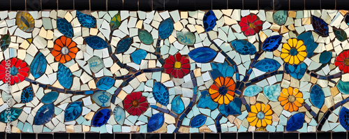 Colorful mosaic with a floral motif, using a diverse color palette to create a beautiful and intricate pattern.