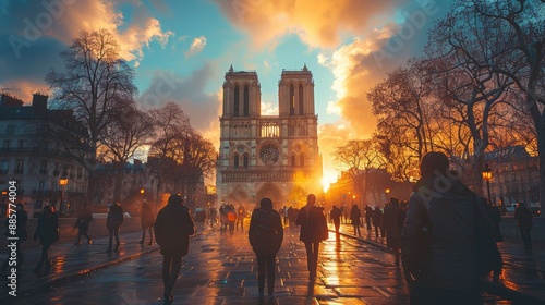 Crowds of people walking on a bridge with a majestic gothic cathedral in the background