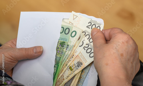 Seniorka wyciąga polskie pieniądze z koperty