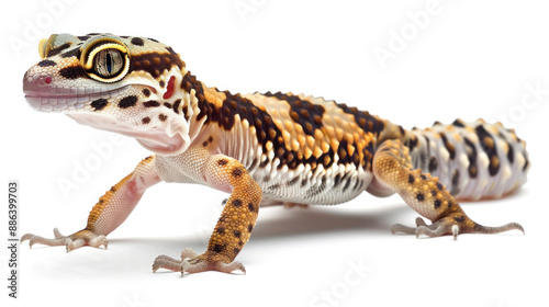 Closeup of isolated white leopard gecko lizard with bright yellow eye on white background