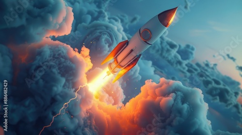 Rocket ship blasting off into the stratosphere through stormy clouds