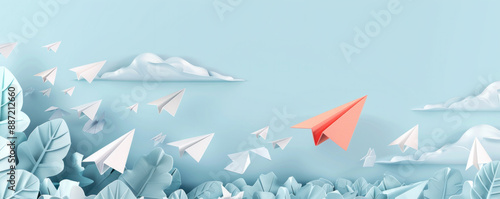 A red paper airplane flying through a blue sky with many other paper airplanes. Concept of freedom and adventure, as the lone red plane soars above the others