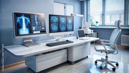 A modern medical workstation with a desktop computer, bone density scan results on the screen, and a radiograph nearby.