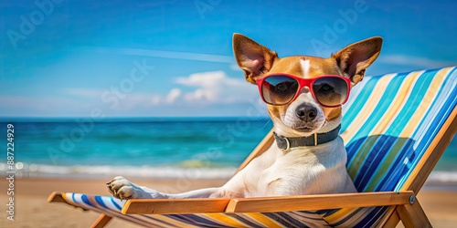 Dog in sunglasses relaxing on a sun lounger at the beach , summer, sea, rest, vacation, pet, canine, lounging, relaxation