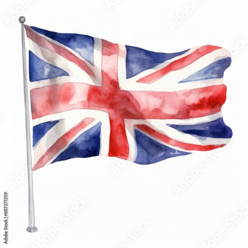 A watercolor painting of the Union Jack flag waving in the wind on a white background