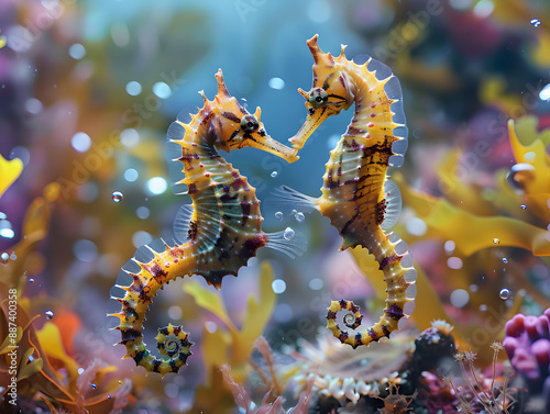 Two seahorses gracefully intertwine in a mesmerizing underwater courtship dance, surrounded by colorful corals.