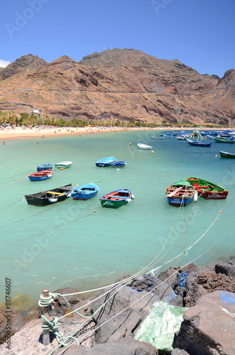 Kolorowe łodzie rybackie na plaży Teresitas na Teneryfie