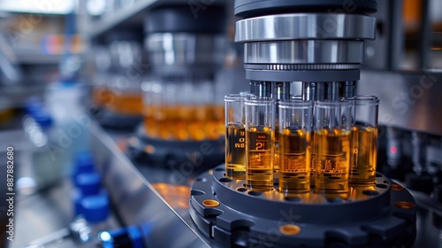Close-up of a laboratory machine filling glass tubes with a yellow liquid, showcasing automated processes and potential applications in research and development.