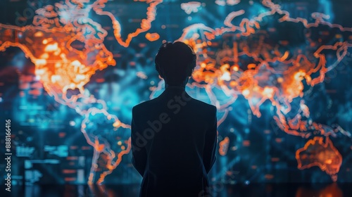 Geoeconomics and geopolitics: silhouette of a person with their back turned, looking at a world map on a screen to direct operations and control the future of countries.