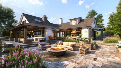suburban farmhouse with a large patio area designed for entertaining, featuring an outdoor kitchen, a dining area, and a lounge with a fire pit
