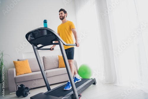 Photo of attractive nice athletic strong man in sportswear physical exercises running treadmill indoors home gym