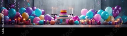 Birthday party, colorful balloons, joyful faces, cake with candles, bright decorations, indoor setting, mid-shot, high detail