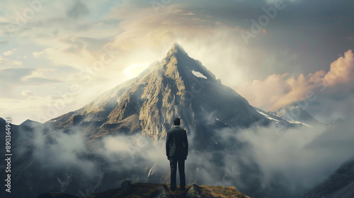 A businessman dressed in a suit stands at the foot of a mountain, which symbolizes serious challenges and obstacles in his career path.