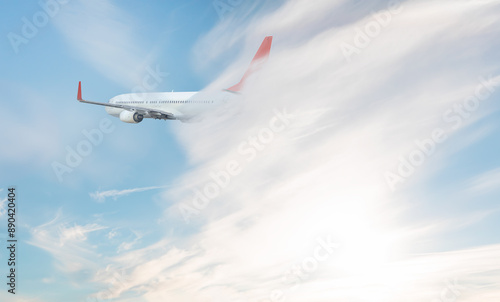 An airplane shakes during turbulence flying air hole - A plane spinning in round clouds - Front view of an airplane